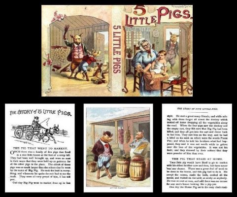 Five Little Pigs Book. Five Little Pigs is a miniature reproduction of Five Little Pigs written and illustrated by W. W. Denslow and originally published in 1903. This miniature reproduction has 12 pages not including the flyleaves. There are four full color plates and many full color illustrations interspersed in the text. This volume is 31/32" high by 25/32" wide and 1/8" thick. The spine is printed with the title so the volume will look well on a bookshelf.
