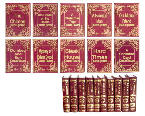 This dollhouse miniature Charles Dickens classics 10 book set are done in one inch (1:12) miniature scale. These dollhouse Charles Dickens book collection books do not open and have no pages. The titles included are Charles Dickens classics as shown.