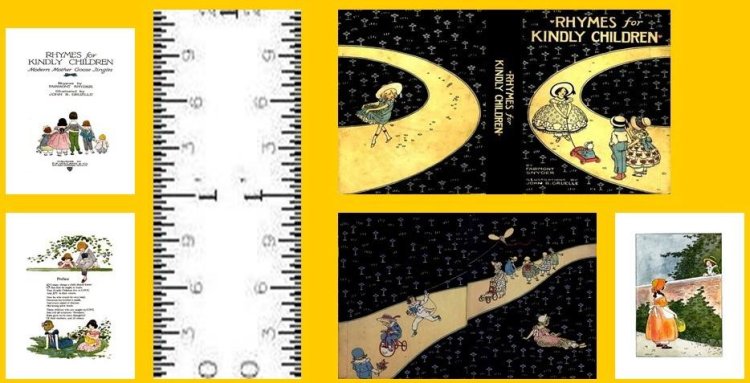 This miniature dollhouse book, Rhymes For Kindly Children is a hardbound, handcrafted miniature reproduction of Rhymes For Kindly Children written by Ethel Fairmont and illustrated by Johnny Gruelle and published in 1916. It contains the full text and color illustrations of the story and is 94 pages long. There are 32 full color plates along with many color illustrations throughout the text. This volume measures 31/32 inch high by 25/32 inch wide by 3/16 inch thick.