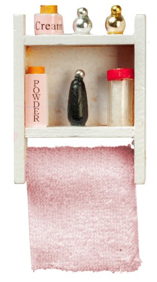 This miniature pink bathroom wall organizer in white painted wood is a 1:12 scale dollhouse decorating accessory. Size: 2" H x 1-7/16" W x 1/4" D.