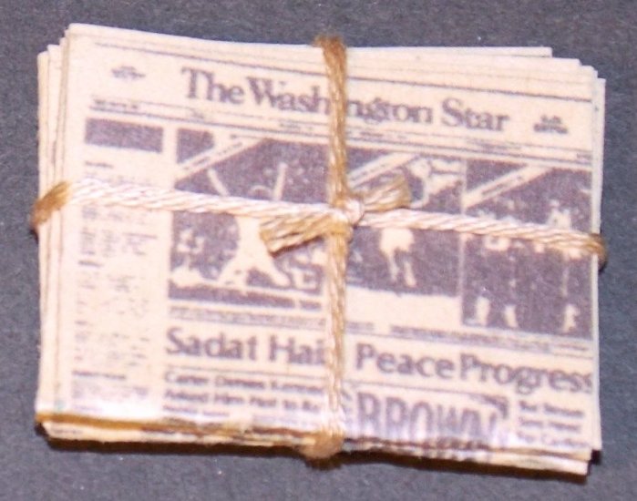 This awesome dollhouse miniature is a stack of yellowed, vintage newspapers, tied up with a rope. Perfect miniature for your general store! The vintage newspapers are printed nicely and the papers are 1-1/4" by 1" in their current folded state.