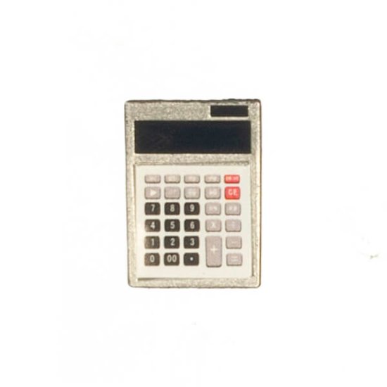 This silver-tone metal miniature calculator is a 1:12 scale dollhouse office accessory. Size: 11/16" tall by 1/2" wide by 1/16" thick.