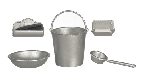 This miniature rustic silver wash access is a 1:12 scale dollhouse kitchen accessory. Size: 0.875 inches tall by 0.875 inches wide by 0.875 inches deep.