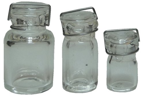 Glass Canning Jars-Clear Glass 3pc. This dollhouse miniature is 1:12 scale. The largest is 1''H x 1/2''W, medium is 1''H x 3/8''W and the smallest is 3/4''H x 3/8''W. These are real glass jars.