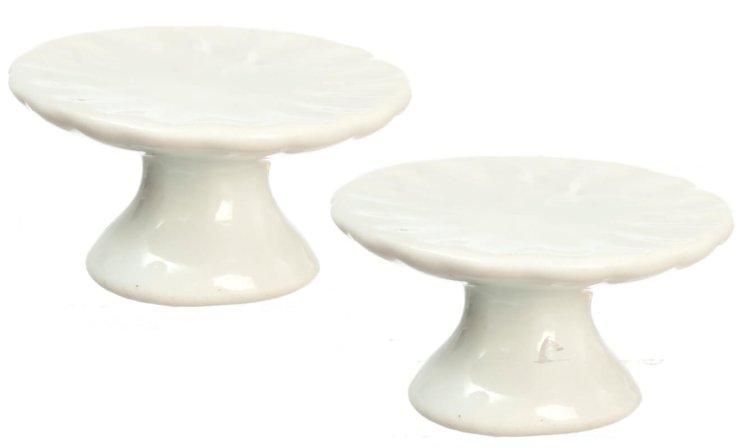 This miniature set of 2 pedestal white ceramic cake displays are 1:12 scale dollhouse accessories. Size: 0.5" tall by 0.75" in diameter.
