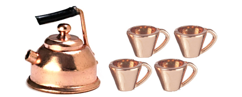 This miniature real copper dollhouse tea set is done in 1:12 scale. The miniature dollhouse tea set includes a real copper teapot and 4 cups. Size: teapot 11/16" by 3/8" diameter.