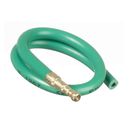 This miniature dollhouse green garden hose section is a 1:12 scale section of real rubber hose with a non-moving, brass spray nozzle end which is partially wound up, as shown. The mini dollhouse garden hose measures about 3/16" by 1-1/8" by 3/4".