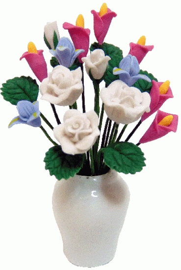 This beautiful arrangement of roses, lilies and Irises are in 1 inch(1:12) miniature scale and sits in a white vase. This arrangement is perfect for your kitchen or dining room.