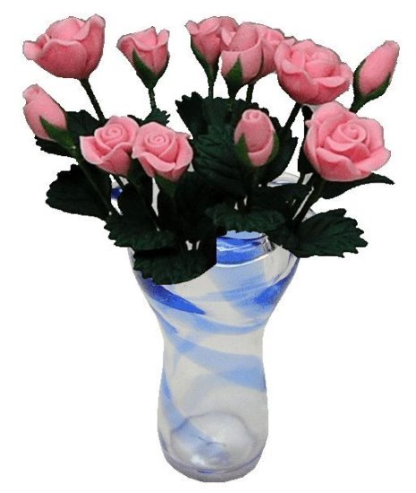 This beautifully crafted dollhouse miniature Pink Roses in Blue Striped Ruffle Vase is 1:12 scale. This vase is a frosted white and is blue striped ruffle vase which is filled with twelve pink roses. Just think of how amazing this arrangement would look on your dollhouse kitchen table!