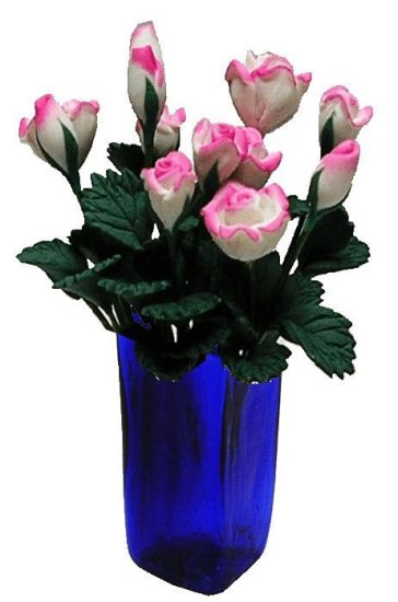Pink & White Roses in Blue Square Vase 12pc Dollhouse Miniature