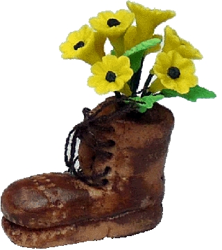 This uniquely crafted dollhouse miniature Yellow Lazy Susans in Boot Planter is 1:12 scale. These yellow lazy susans are planted in a boot planter! Just think of how amazing these lazy susans would look on your dollhouse front porch!