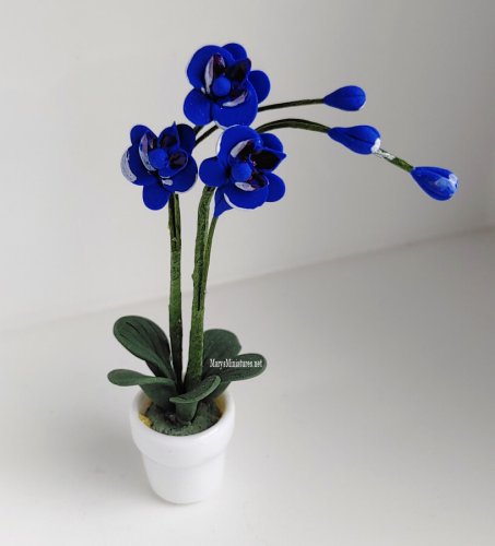 This miniature midnight blue orchid in a white ceramic pot is a resin dollhouse accessory in 1:12 scale. Size: 2.75" tall by 1.8" wide.