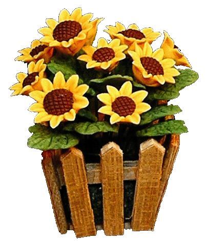 Sunflowers in Picket Fence Planter. This dollhouse miniature is 1:12 scale. This planter measures 1-3/4" tall by about 1-3/4" wide. The planter is 1" wide at the very bottom and the pickets are real wood and could easily be painted or stained. What a wonderful and realistic plant to add to any room indoors and outdoors and put those final touches to your dollhouse.
