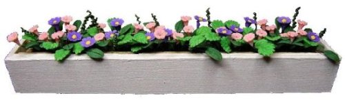Pink and Purple Flowers in White Window Box. This dollhouse miniature is 1:12 scale. This window box will surly help to decorate the outside of your dollhouse. This window box is 5-3/4'' long.