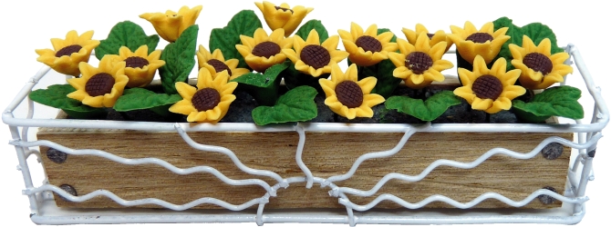 This miniature window box style Sunflowers in Sunrise Wrought Iron in long planter is a highly detailed miniature by Bright deLights. The 1:12 scale Sunflowers in Sunrise Wrought Iron has the incredible detail and quality you can always expect from Bright deLights.