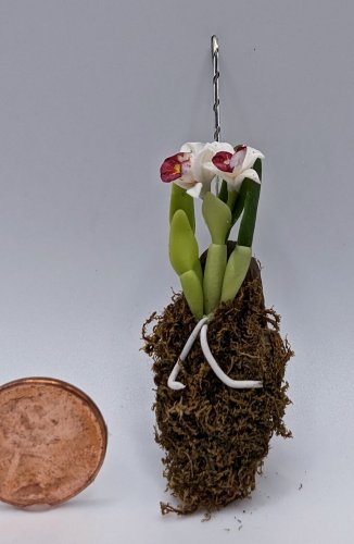 This red & yellow hanging orchid is a delightful 1:12 scale hanging orchid with lovely res and yellow flowers. Exotic house plants like this can help you add color and flare to your dollhouse settings. Size: 2.25" tall without hanger wire.