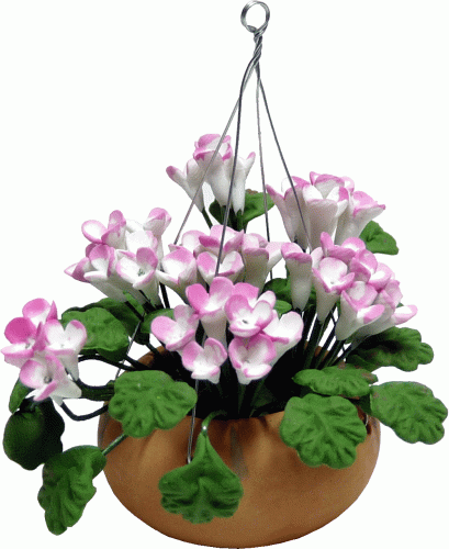 These nice looking miniature hanging pink and white flowers are in 1:12 miniature scale and they are perfect for your dollhouse front porch! Size: 2.38"H with hook by about 1.5" in diameter.