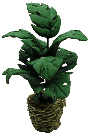This dollhouse miniature palm plan in a woven basket is 1:12 scale. The miniature potted palm measures about 2.2" tall, the pot is 0.75" tall by 0.75" in diameter.