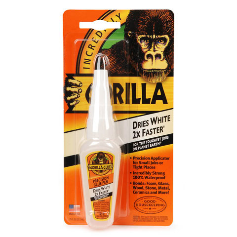 Gorilla® Glue. Fast Cure Pen. Dries White. .75 oz. This Gorilla® Glue fast cure pen includes .75 ounces of white glue. This glue is incredibly strong, 100% waterproof, and safe for both indoor and outdoor use. It bonds foam, glass, wood, stone, metal, and more, and it dries 2x faster than original Gorilla Glue.