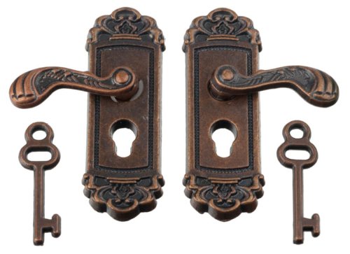 "This 1:12 scale dollhouse miniature set features a faux dark brass lock and handle design, including 2 plates and 2 key-style locks. Perfect for adding realistic detail to miniature doors or furniture. Each piece measures approximately 0.875" tall, 0.375" wide, and 0.5" deep."