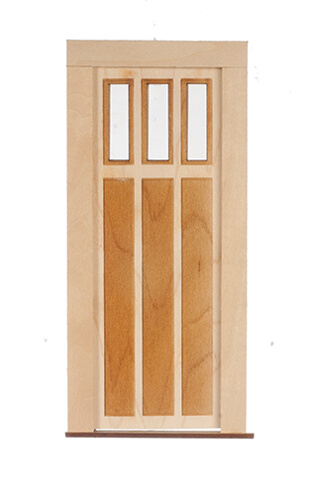 This laser cut unfinished basswood dollhouse prairie door is a miniature building accessory in 1:12 scale. Fits 7" by 3" opening.