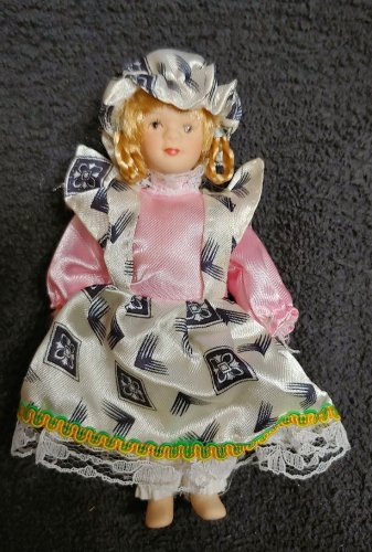 This beautiful porcelain girl doll is 6" tall, wearing a white print dress with pink shirt and a bonnet. The miniature porcelain girl doll for your dollhouse has movable head, arms and legs, she can bend at the waist, but she does not bend at the elbows and knees. This cute doll's clothes are no removable.