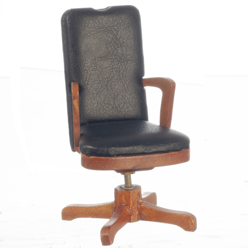 This miniature dollhouse office Faux Brown Leather Swivel Desk Chair is a very detailed 1:12 scale miniature finished in rich Walnut. The Old fashioned desk chair, Faux Brown Leather Swivel Desk Chair in Walnut measures 3.75" tall by 2.375" wide.
