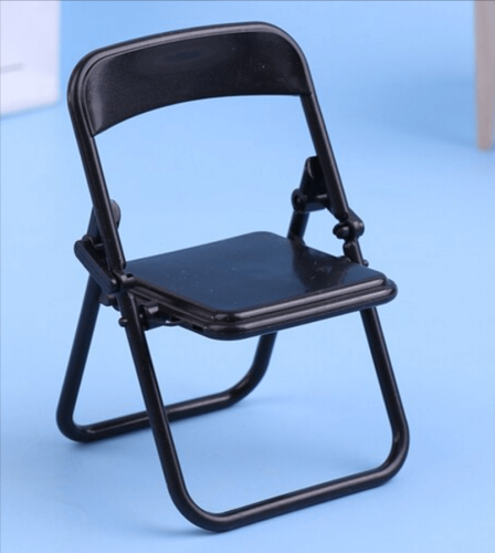 This black plastic miniature folding chair is a 1:12 scale dollhouse accessory. Size: 3.82" tall by 2.64" wide by 2.47" deep.