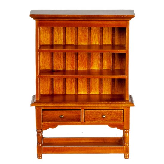 This walnut finished wooden miniature country style hutch with working drawers is a 1:12 scale dollhouse furniture accessory. Size: 5-3/4" H by 4-1/8" W by 1-5/8" D.