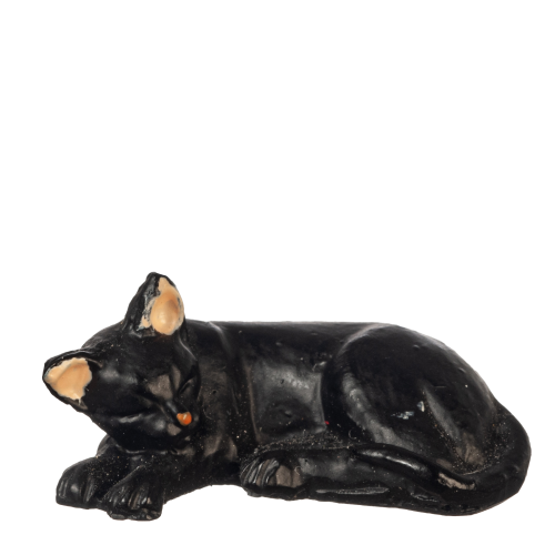 This miniature left laying black cat is a 1:12 scale dollhouse item. Size: 0.5 inches tall by 1.125 inches wide by 0.875 inches deep.