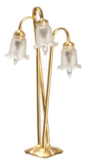 Brighten your dollhouse with this elegant 3-tulip shade arched floor lamp. Designed in 1:12 scale and powered by a 12V system, this beautifully detailed fixture is easy to connect and brings a graceful touch to any miniature room.