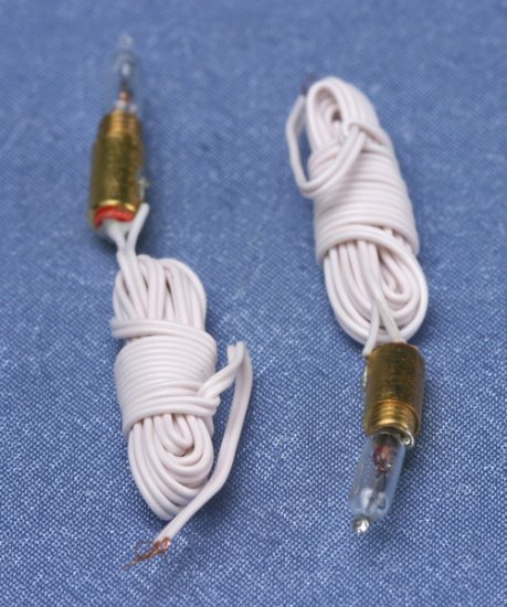 This miniature dollhouse accessory is a 2 pack of white lead (round wire) with attached plugs, 12 volt bulb sockets with a candle flame style screw base bulb in each. The miniature replacement candle stick bulbs are 1:12 scale. Great for repairing as well as creating miniature lights for your dollhouse. Model numbers MH807 & MH0807.