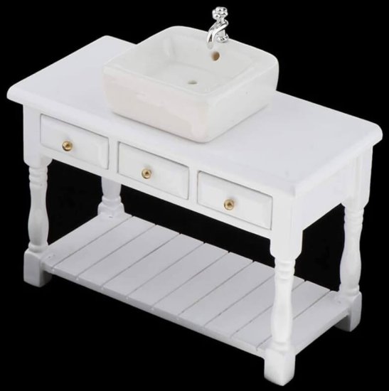 This miniature white painted wood country wash basin style sink on table with 3 working drawers is a 1:12 scale dollhouse farmhouse kitchen accessory. Size: 2.76" tall by 4.07" wide by 1.87" deep.