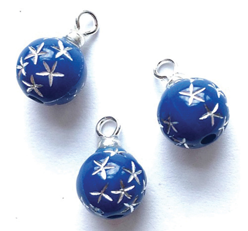 This dollhouse miniature starburst ornament is 1:12 scale. This ornamnet is navy in color with a silver star design. Each measures 1/2"H including the hoop.