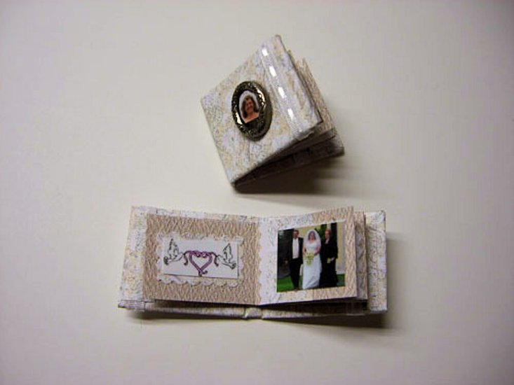 This miniature wedding scrapbook picture album is a American made, hand crafted 1:12 scale dollhouse miniature. The miniature wedding scrapbook opens and has 4 pages with scrapbook embelishments and pictures inside. Size: 0.86" tall by 1.2" wide by 0.33" thick.