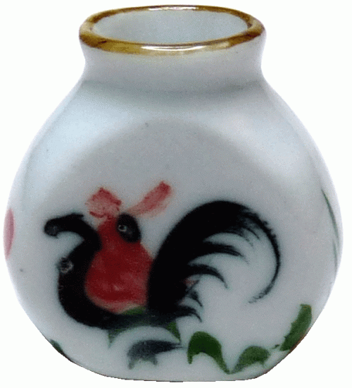 This miniature dollhouse decorating accessory is a Ceramic Rooster Design Flat Vase. The dollhouse Ceramic Rooster Design Flat Vase by Bright deLights is real ceramic and done in 1:12 scale.