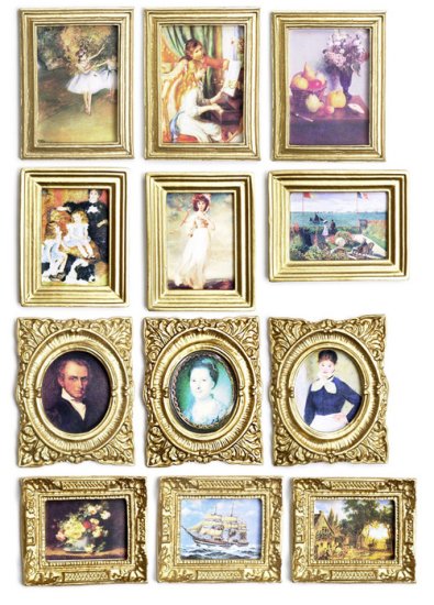 Framed Masterpieces/12pc. This miniature assortment of framed masterpieces are 1/12'' scale and will make a fine addition to your dollhouse.