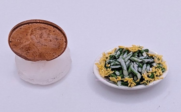 This white ceramic miniature dish of green bean casserole is a 1:12 scale dollhouse food accessory. Size: 0.33" tall by 0.98" wide by 0.7" deep.