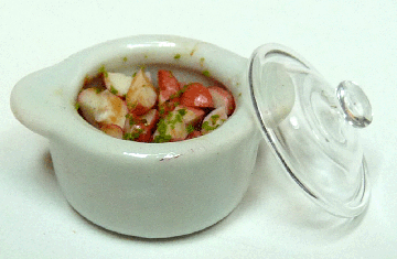 Red Potato Casserole with Glass Lid. This miniature Red Potato casserole is 1/12'' scale and will make a fine addition to your dollhouse.