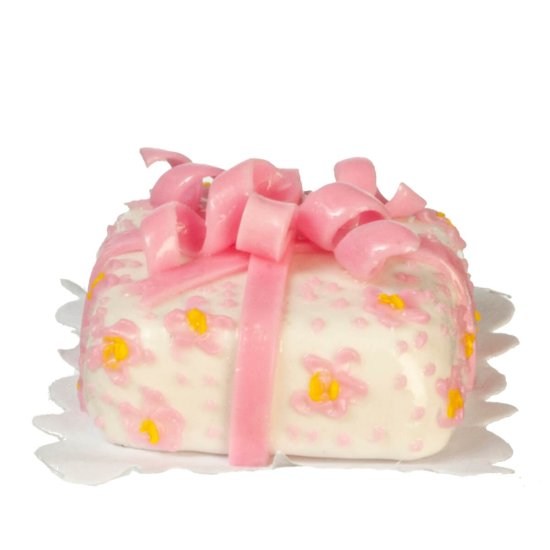 This miniature decorated pink gift cake on paper doily is a 1:12 scale dollhouse food accessory. Perfect for a mini baby shower!