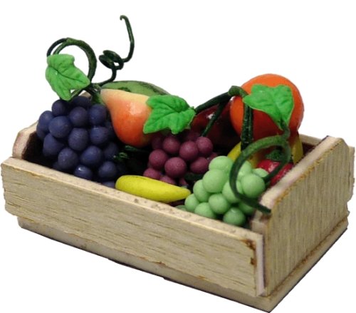 Assorted Fruits in Crate. This miniature wooden crate holds an assortment of realistic-looking fruit. The fresh fruit crate is 1:12 scale and will look great displayed in your dollhouse.