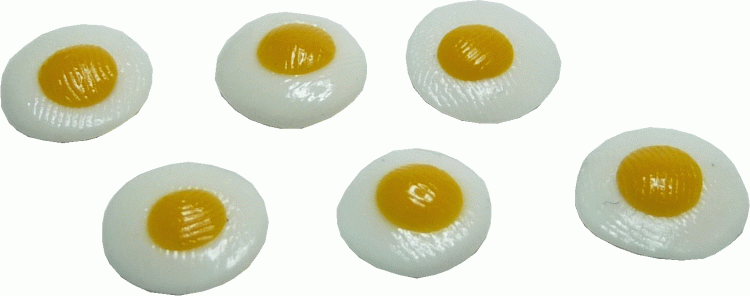 Perfect for your dollhouse breakfast scenes, this set includes six miniature fried eggs, each measuring 1/4" in diameter. Please note, the eggs come without a plate or pan. They’re ideal for pairing with toast, milk, or any cozy breakfast setup in your miniature kitchen.