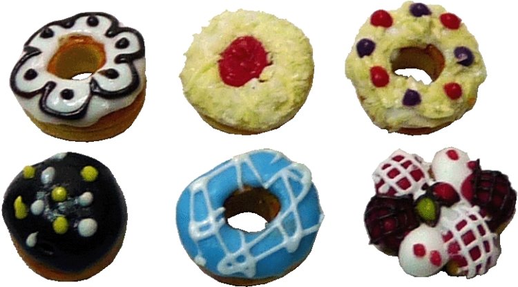 Fancy Donuts/ Pastries. These 6 Fancy Donuts or Pastries will dazzle you with their beauty. The miniature donuts are decorated in great detail and each one is different. They make a great dollhouse breakfast. The Donuts are 1:12 scale.
