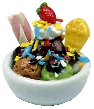 Chocolate Sundae in Small Bowl. This miniature Chocolate Sundae is served in a small bowl. The 1:12 scale colorful sundae has multiple toppings and makes a fun dollhouse treat. The small bowl is 3/4" in diameter.