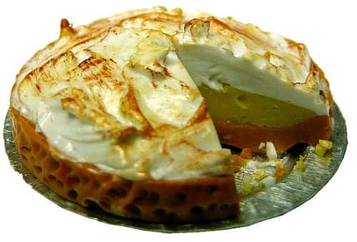 This lovely dollhouse miniature Lemon Meringue Pie is 1:12 scale. This pie is lemon meringue flavored and has one slice cut out of the pie. It also comes in a tin pie pan.