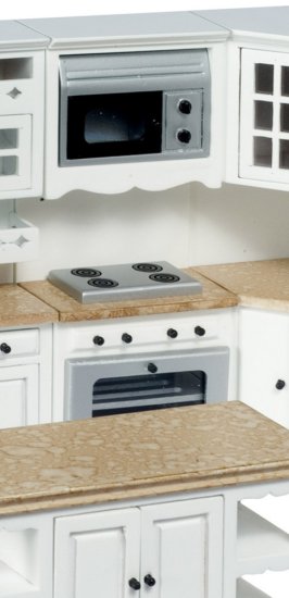 This white kitchen cabinet unit is 1:12 scale, has the stove and microwave included in silver like stainless steel and a faux marble counter top. The white & faux marble stove counter unit is part of dollhouse kitchen set number T5414 and measures 3" W x 1-3/4" D x 7-1/8" H.