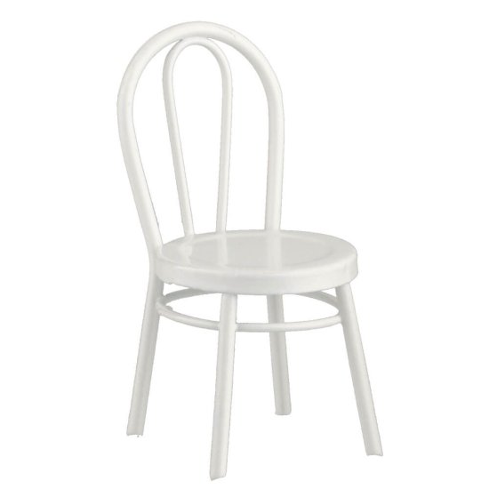 This white painted small metal miniature bentwood side chair is a 1:12 scale dollhouse dining room accessory. Size: 3.125" tall by 1.5" wide by 1.75" deep.